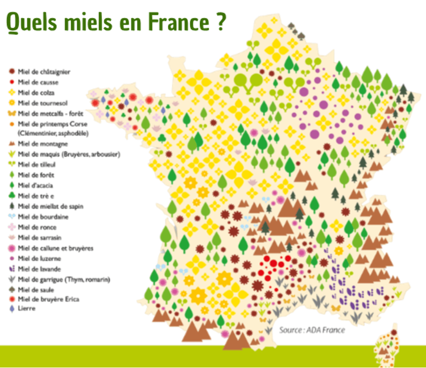 Rien qu’en France, selon les zones géographiques, on retrouve plus de 25 appellations de miels. L’Ouest de l’hexagone produira surtout le miel de colza et de tournesol ; le nord-est bénéficie de la luzerne, du sapin et des miels de forêts ; on retrouvera le miel de lavande et de garrigue en Provence; tandis que d’autres régions verront fleurir la bruyère, le sarrasin, le miel de bourdaine ou encore le châtaignier…